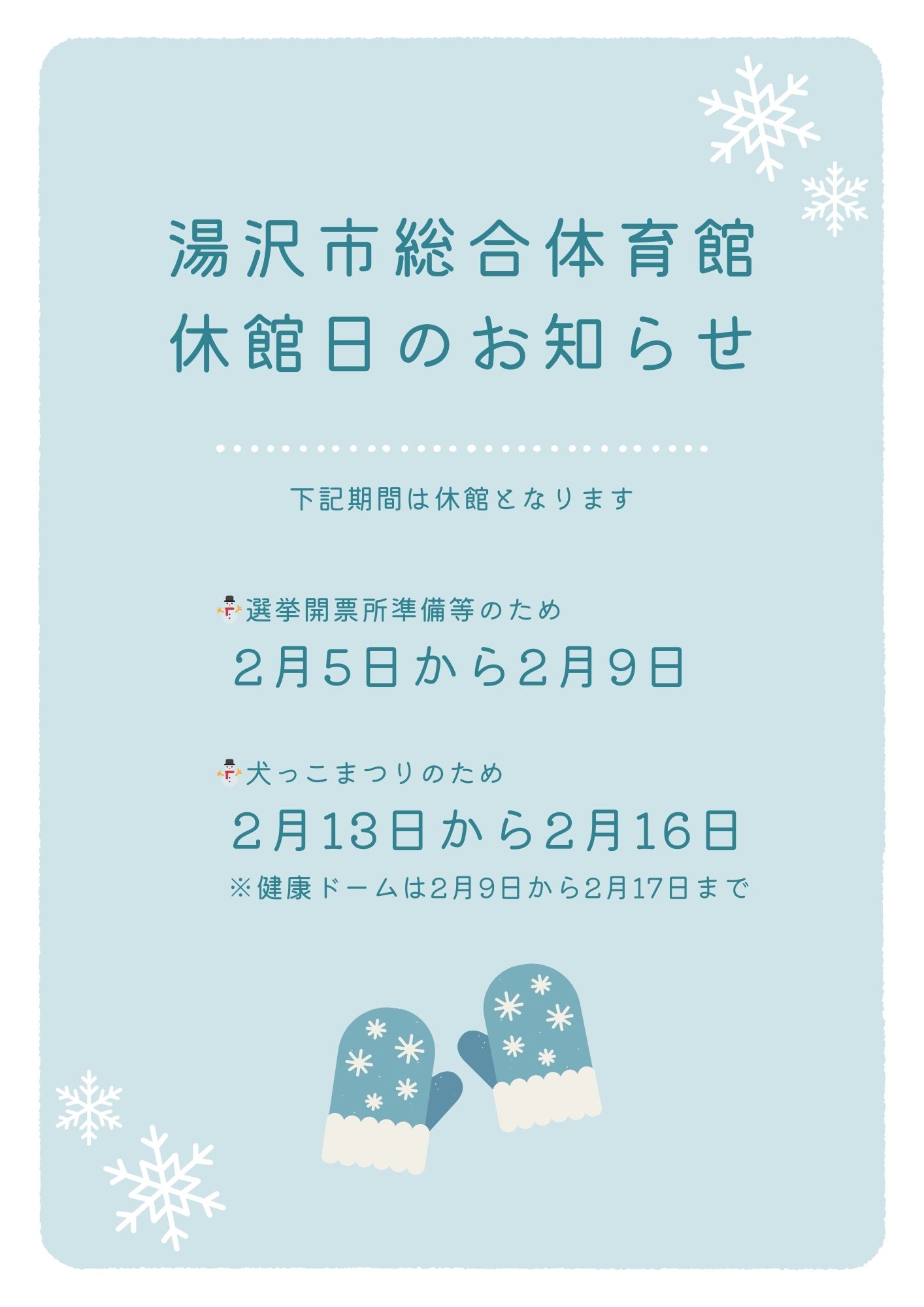 いつも当施設をご利用いただき、ありがとうございます。下記期間は一般の方のご利用をお断りしております。